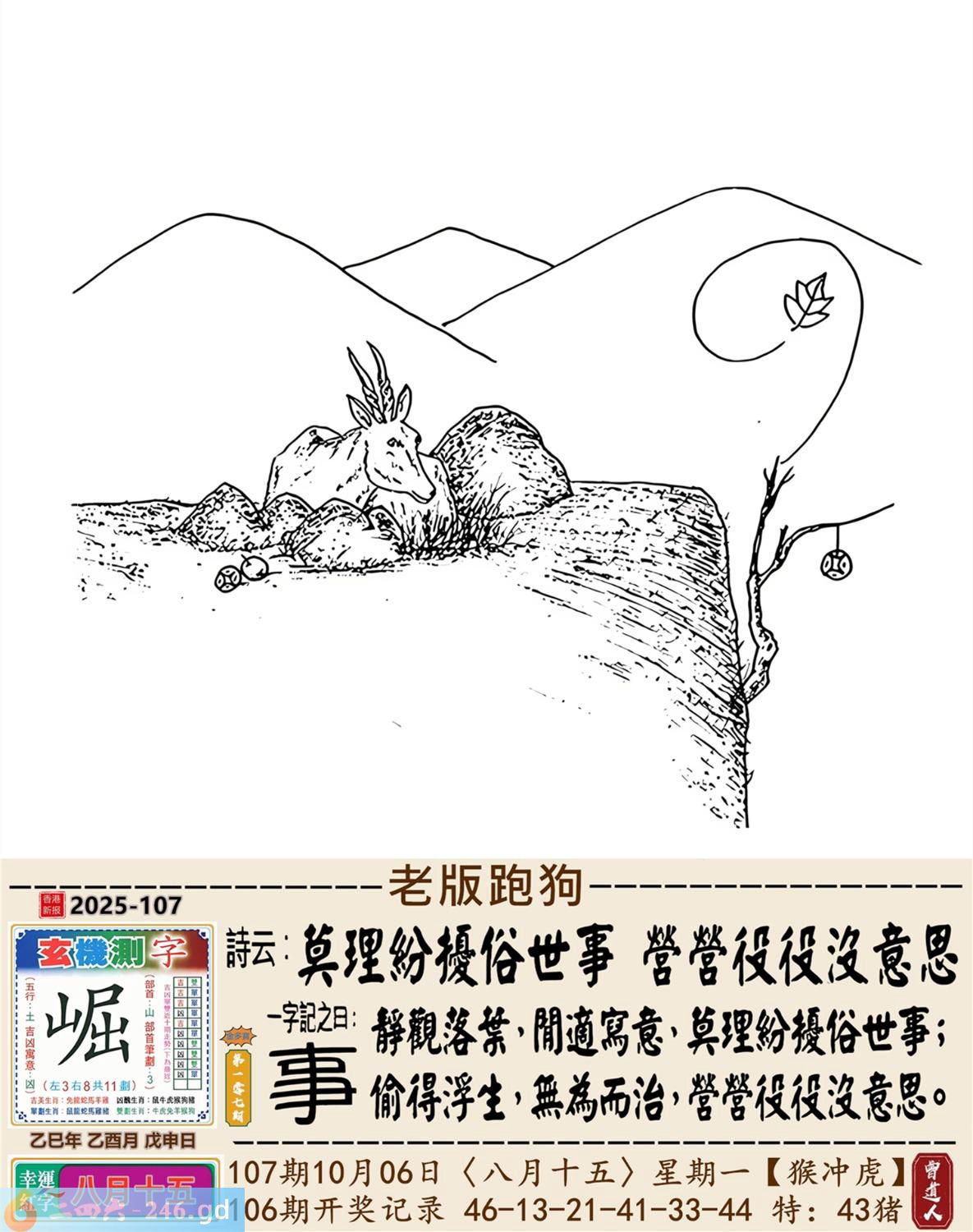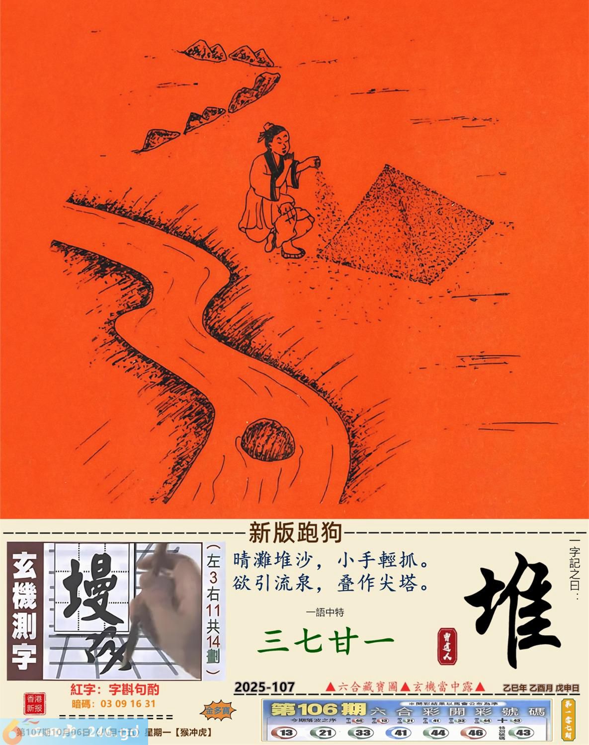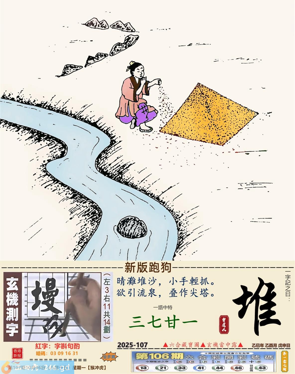 2025年10月6日107期虎(壬寅)(大驿土) 107期:老版跑狗玄機一字記之曰:【事】 詩云:莫理紛擾俗世事營營役役沒意思 靜觀落葉,開適寫意,莫理紛擾俗世事; 偷得浮生,無為而治,營營役役沒意思。 玄機測字:《崛》 密圖詩:一對核桃一對棗 《記》:試看宮中有玉兔 特碼大小單雙句:伸手要錢 今期必中:黃月英 107期:特碼歇后語 粪车掉了轮子-----摆臭架子 107期正版四字梅花诗:趁虚而入。 107期火车头:烧伤猪。诗:猴死马伤,本期看好二三肖。 107期香港第一手欲钱料:龙? 107期曾道人说:“大?” 107期另版四字梅:竹篱瓦舍。 107期香港第一手欲钱料:欲钱一心向大路。 107期曾道人说:“为什么天气还是这么热呢”? 107期:二字經:看准 107期:小偷是特码 107期:智力金壤:争分夺秒 107期:信箱紅字:【字斟句酌】 107期:【暗碼:03-09-16-31】 107期:一語中特:【三七甘一】 發财玄機圖:大器小用固執不通圖中明牛紅藍 107期:藏寳圖 新:面对叁江对伍峰 老:章台人去骨遗香 禁:龙禁:8尾玄机字《备》 2025年107期【生活幽默】版 〖被炒〗 老馬做建築工作,最近被炒了,我問他怎麽回事。 “你知道工頭是幹什麽的嗎?就是站在旁邊看别人幹活。” “這與你被炒有什麼關系?”我不解。 老馬解釋,“他妒忌,因爲大家都以爲我才是工頭。”