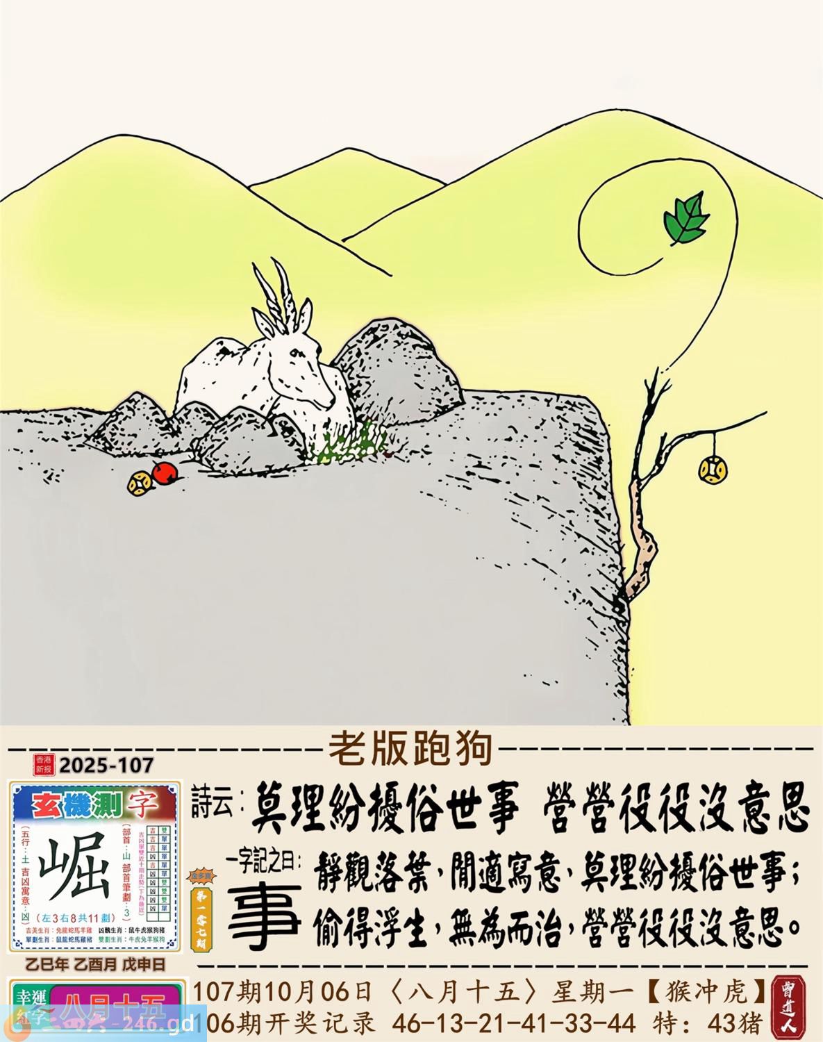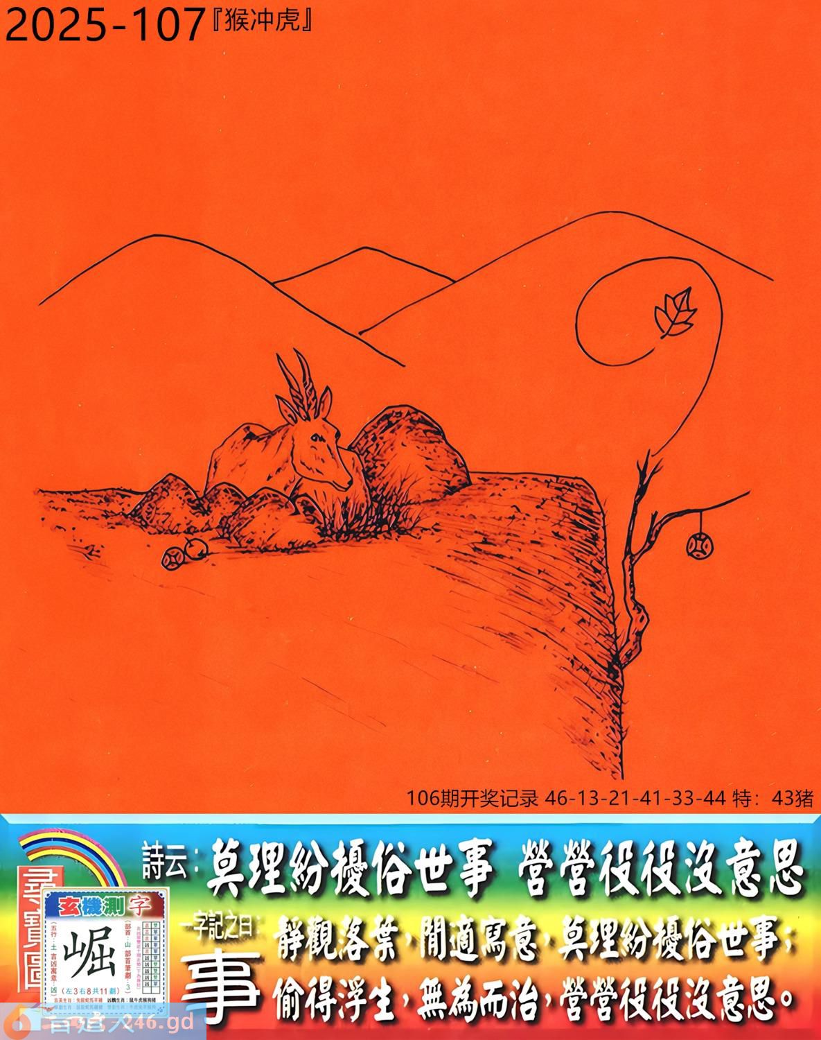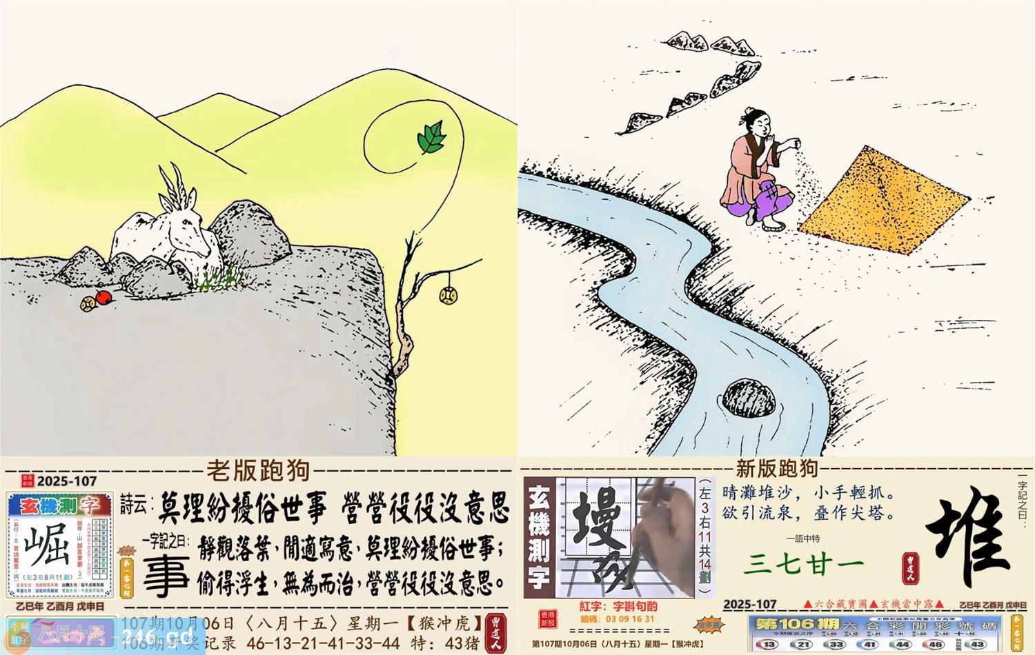 2025年10月6日107期虎(壬寅)(大驿土) 107期:老版跑狗玄機一字記之曰:【事】 詩云:莫理紛擾俗世事營營役役沒意思 靜觀落葉,開適寫意,莫理紛擾俗世事; 偷得浮生,無為而治,營營役役沒意思。 玄機測字:《崛》 密圖詩:一對核桃一對棗 《記》:試看宮中有玉兔 特碼大小單雙句:伸手要錢 今期必中:黃月英 107期:特碼歇后語 粪车掉了轮子-----摆臭架子 107期正版四字梅花诗:趁虚而入。 107期火车头:烧伤猪。诗:猴死马伤,本期看好二三肖。 107期香港第一手欲钱料:龙? 107期曾道人说:“大?” 107期另版四字梅:竹篱瓦舍。 107期香港第一手欲钱料:欲钱一心向大路。 107期曾道人说:“为什么天气还是这么热呢”? 107期:二字經:看准 107期:小偷是特码 107期:智力金壤:争分夺秒 107期:信箱紅字:【字斟句酌】 107期:【暗碼:03-09-16-31】 107期:一語中特:【三七甘一】 發财玄機圖:大器小用固執不通圖中明牛紅藍 107期:藏寳圖 新:面对叁江对伍峰 老:章台人去骨遗香 禁:龙禁:8尾玄机字《备》 2025年107期【生活幽默】版 〖被炒〗 老馬做建築工作,最近被炒了,我問他怎麽回事。 “你知道工頭是幹什麽的嗎?就是站在旁邊看别人幹活。” “這與你被炒有什麼關系?”我不解。 老馬解釋,“他妒忌,因爲大家都以爲我才是工頭。”