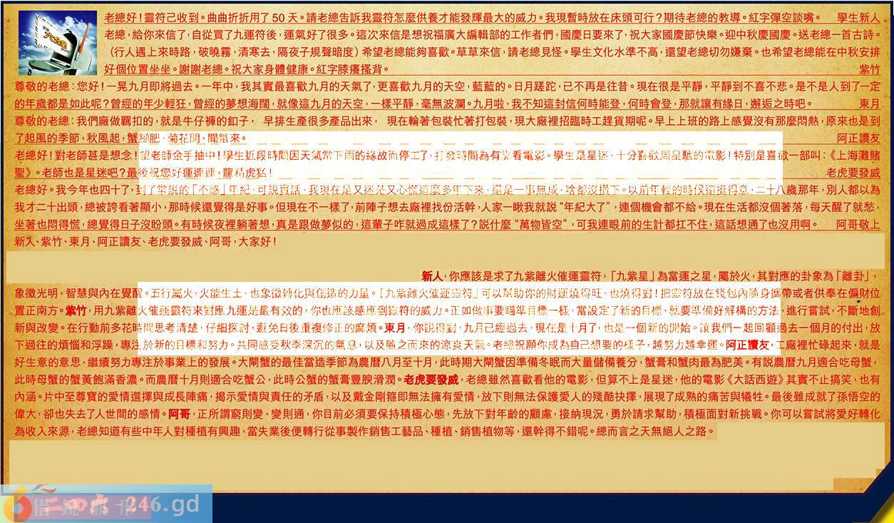 第111期《六合皇信箱文字版》10000%正確!!!正版二四六論壇*精心製作!!! 新人、紫竹、東月、阿正讀友、老虎要發威、阿哥,大家好! 【1】.老總好!靈符己收到。曲曲折折用了50天。請老總告訴我靈符怎麼供養才能發輝最大的威力。我現暫時放在床頭可行?期待老總的教導。紅字彈空談嘴。學生新人 〖新人〗:你應該是求了九紫離火催運靈符,「九紫星」為當運之星,屬於火,其對應的卦象為「離卦」,象徵光明、智慧與內在覺醒。五行屬火,火能生土,也象徵轉化與創造的力量。「九紫離火催運靈符」可以幫助你的財運燒得旺,也燒得對!把靈符放在錢包內隨身攜帶或者供奉在偏財位置正南方。 【2】.老總,給你來信了,自從買了九運符後,運氣好了很多。這次來信是想祝福廣大編輯部的工作者們,國慶日要來了,祝大家國慶節快樂。迎中秋慶國慶。送老總一首古詩。(行人遇上來時路,破曉霧,清寒去,隔夜子規聲暗度)希望老總能夠喜歡草草來信,請老總見怪。學生文化水準不高,還望老總切勿嫌棄。也希望老總能在中秋安排好個位置坐坐。謝謝老總。祝大家身體健康。紅字膝癢搔背。紫竹 〖紫竹〗:用九紫離火催運露符來對應九運是最有效的,你也應該感應到靈符的威力。正如做事要瞄準目標一樣,當設定了新的目標就要準備好解構的方法,進行嘗試,不斷地創新與改變。在行動前多花時間思考清楚,仔細探討,避免日後重複修正的麻煩。 【3】.尊敬的老總:您好!一晃九月即將過去。年中,我其實最喜歡九月的天氣了,更喜歡九月的天空,藍藍的。日月蹉跎,已不再是往昔。現在很是平靜,平靜到不喜不悲。是不是人到了一定的年歲都是如此呢?曾經的年少輕狂,曾經的夢想海闊,就像這九月的天空,一樣平靜,毫無波瀾。九月啦,我不知這封信何時能登,何時會登,那就讓有緣日,邂逅之時吧。東月 〖東月〗:你说得對,九月已經過去現在是十月了,也是一個新的開始。讓我們一起回顧過去一個月的付出,放下過往的煩惱和浮躁,專注於新的目標和努力。共同感受秋季深沉的氣息。以及随之而來的涼爽天氣。老總祝願你成為自己想要的樣子,越努力越幸運。 【4】.尊敬的老總:我們廠做羈扣的,就是牛仔褲的釦子,早排生產很多產品出來,現在輪著包裝忙著打包装,現大廠裡招臨時工趕貨期呢。早上上班的路上感覺沒有那麼悶熱,原來也是到了起風的季節,秋風起,蟹腳肥,菊花開,聞蟹來。阿正讀友 〖阿正讀友〗:工廠裡忙碌起來,就是好生意的意思,繼續努力專注於事業上的發展。大閘蟹的最佳當造季節為農曆八月至十月,此時期大閘蟹因準備冬眠而大量儲備養分,蟹膏和蟹肉最為肥美。有說農曆九月適合吃母蟹,此時母蟹的盤黃飽滿香濃。而農曆十月則適合吃蟹公,此時公蟹的蟹膏豐腴滑潤。 【5】.老總好!對老師甚是想念!望老師金手抽中!學生近段時間因天氣常下雨的緣故而停工了,打發時間為有靠看電影。學生是星迷,十分喜歡周星馳的電影!特別是喜歡一部叫::《上海灘賭聖》。老師也是星迷吧?最後祝您好運連連,龍精虎猛!老虎要發威 〖老虎要發威〗:老總雖然喜歡看他的電影,但算不上是星迷,他的電影《大話西遊》其實不止搞笑,也有內涵。片中至尊寶的愛情選擇與成長陣痛,揭示愛情與責任的矛盾,以及戴金剛箍即無法擁有愛情,放下則無法保護愛人的殘酷抉擇,展現了成熟的痛苦與犧牲。最後雖成就了孫悟空的偉大,卻也失去了人世間的感情。 【6】.老總好。我今年也四十了,到了常說的「不惑」年紀,可說實話,我現在是又迷茫又心慌這麼多年下來,還是一事無成,啥都沒攢下。以前年輕的時候還挺得意,二十八歲那年,別人都以為我才二十出頭,總被誇看著顯小,那時候還覺得是好事。但現在不一樣了,前陣子想去廠裡找份活幹,人家一瞅我就說“年紀大了”,連個機會都不給。現在生活都沒個著落,每天醒了就愁,坐著也悶得慌,總覺得日子沒盼頭。有時候夜裡躺著想,真是跟做萝似的,這輩子咋就過成這樣了?說什麼“萬物皆空”,可我連眼前的生計都扛不住,這話想通了也沒用啊。阿哥敬上 〖阿哥〗:正所謂窮則變、變則通,你目前必須要保持積極心態,先放下對年齡的顧慮,接納現況,勇於請求幫助,積極面對新挑戰。你可以嘗試將爱好轉化為收入來源,老總知道有些中年人對種植有興趣,當失業後便轉行從事製作銷售工藝品、種植、銷售植物等,還幹得不錯呢。總而言之天無絕人之路。 紅字:借鏡觀形 暗码:04072131 [释义]比喻参考和吸取别人的经验教训。 [出处]《刘子新论·贵言》:“人目短于自见,故借镜以观形。”