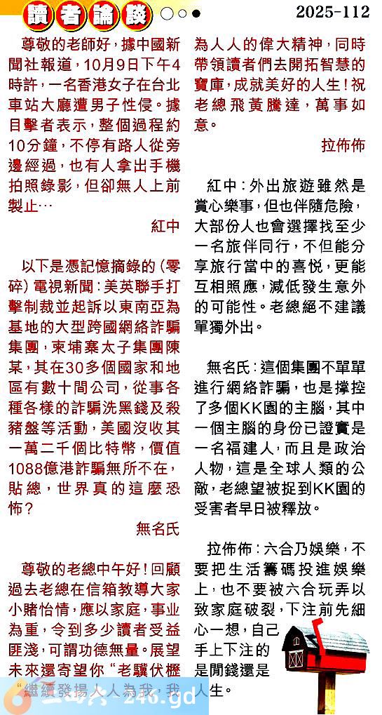 第一一二期讀者論談 1.尊敬的老師好,據中國新聞社報道,10月9日下午4時許,一名香港女子在台北車站大廳遭男子性侵.據目擊者表示,整個過程約10分鐘,不停有路人從旁邊經過,也有人拿出手機拍照錄影,但卻無人上前裂止...紅中 〖紅中〗:外出旅遊雖然是賞心樂事,但也伴隨危險,大部份人也會選擇找至少一名旅伴同行,不但能分享旅行當中的喜悦,更能互相照應,減低發生意外的可能性。老總絕不建議單獨外出。 2.以下是憑記憶摘錄的(零碎)電視新聞:美英聯手打擊制裁並起訴以東南亞為基地的大型跨國網絡詐騙集團,柬埔寨太子集團陳某,其在30多個國家和地區有數十間公司,從事各種各樣的詐騙洗黑錢及殺豬盤等活動,美國沒收其一萬二千個比特幣,價值1088億港詐騙無所不在,貼總,世界真的這麼恐怖?無名氏 〖無名氏〗:這個集團不單單進行網絡詐騙,也是撑控了多個園的主腦,其中一個主腦的身份已證實是一名福建人,而且是政治人物,這是全球人類的公敵,老總望被捉到園的受害者早日被釋放。 3.尊敬的老總中午好!回顧過去老總在信箱教導大家小賭怡情,應以家庭,事业為重,令到多少讀者受益匪淺,可謂功德無量。展望未來還寄望你“老驥伏櫪“繼續發揚人人為我,我為人人的偉大精神,同時帶領讀者們去開拓智慧的寶庫,成就美好的人生!祝老總飛黃騰達,萬事如意。拉佈佈 〖拉佈佈〗:六合乃娛樂,不要把生活籌碼投進娛樂上,也不要被六合玩弄以致家庭破裂,下注前先細心一想,自己手上下注的是閒錢還是人生。