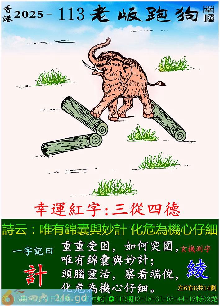 113期老版跑狗一字記之曰:【計】 詩雲:唯有錦囊與妙計,化危為機心仔細。 重重受困,如何突圍,唯有錦囊與妙計; 頭腦靈活,察看端倪,化危為機心仔細。 怎么感觉本期狗图和狗诗没有匹配,就三截木头,就说大象重重受困了, 这么大只的象,受困这么容易的吗?