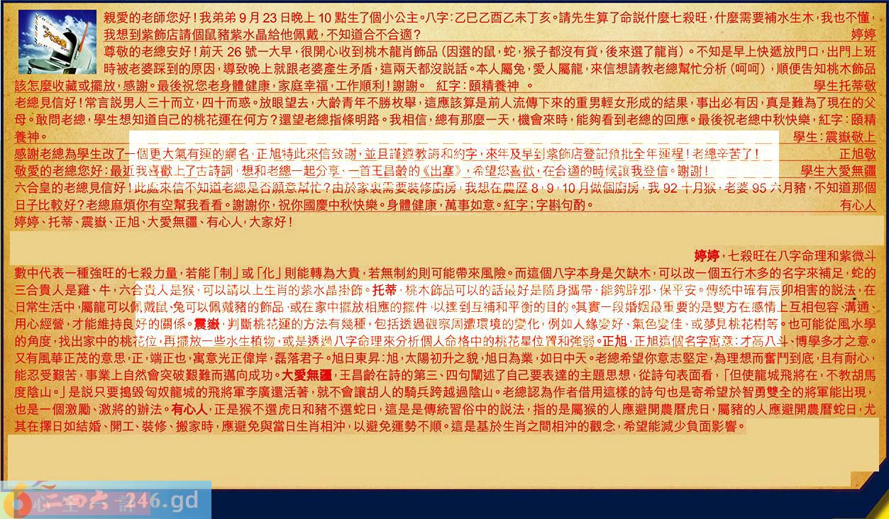 第114期《六合皇信箱文字版》10000%正確!!!正版二四六論壇*精心製作!!! 婷婷、托蒂、震嶽、正旭、大愛無疆、有心人,大家好! 【1】.親愛的老師您好!我弟弟9月23日晚上10點生了個小公主。八字:乙巳乙酉乙未丁亥。請先生算了命說什麼七殺旺,什麼需要補水生木,我也不懂,我想到紫飾店請個鼠豬紫水晶給他佩戴,不知道合不合適?婷婷 〖婷婷〗:七殺旺在八字命理和紫微斗數中代表一種強旺的七殺力量,若能「制」或「化」則能轉為大貴,若無制約則可能帶來風險。而這個八字本身是欠缺木,可以改一個五行木多的名字來補足,蛇的三合貴人是雞、牛,六合貴人是猴,可以請以上生肖的紫水晶掛飾。 【2】.尊敬的老總安好!前天26號一大早,很開心收到桃木龍肖飾品(因選的鼠蛇,猴子都沒有貨,後來選了龍肖)。不知是早上快遞放門口,出門上班時被老婆踩到的原因,導致晚上就跟老婆產生矛盾,這兩天都沒說話。本人屬兔,愛人屬龍,來信想請教老總幫忙分析(呵呵),順便告知桃木飾品該怎麼收藏或擺放,感謝。最後祝您老身體健康,家庭幸福,工作順利!謝謝。紅字:頤精養神。學生托蒂敬 〖托蒂〗:桃木飾品可以的話最好是隨身攜帶,能夠辟邪、保平安。傳統中確有辰卯相害的說法,在日常生活中,屬龍可以佩戴鼠、兔可以佩戴豬的飾品,或在家中擺放相應的擺件,以達到互補和平衡的目的。其一段婚姻最重要的是雙方在感情上互相包容溝通、用心經營,才能維持良好的關係。 【3】.老總見信好!常言說男人三十而立,四十而惑。放眼望去,大齡青年不勝枚舉,這應該算是前人流傳下來的重男輕女形成的結果,事出必有因,真是難為了現在的父母。敢問老總,學生想知道自己的桃花運在何方?還望老總指條明路。我相信,總有那麼一天,機會來時,能夠看到老總的回應。最後祝老總中秋快樂,紅字:頤精養神。學生:震嶽敬上 〖震嶽〗:判斷桃花運的方法有幾種,包括透過觀察周遭環境的變化,例如人緣變好、氣色變佳、或夢見桃花樹等。也可能從風水學的角度,找出家中的桃花位,再擺放一些水生植物,或是透過八字命理來分析個人命格中的桃花星位置和強弱。 【4】.感謝老總為學生改了一個更大氣有運的網名,正旭特此來信致謝,並且謹遵教誨和約字,來年及早到紫飾店登記預批全年運程!老總辛苦了!正旭敬 〖正旭〗:正旭這個名字寓意:才高八斗、博學多才之意。又有風華正茂的意思,正,端正也,寓意光正偉岸,磊落君子。旭日東异:旭,太陽初升之貌,旭日為業,如日中天。老總希望你意志堅定,為理想而奮鬥到底,且有耐心,能忍受艱苦,事業上自然會突破艱難而邁向成功。 【5】.敬愛的老總您好:最近我喜歡上了古詩詞,想和老總起分享,一首王昌龄的《出塞》希望您喜歡在合適的時候讓我登信。謝謝!學生大愛無疆 〖大愛無疆〗:王昌齡在詩的第三、四句闡述了自己要表達的主題思想,從詩句表面看,「但使龍城飛將在,不教胡馬度陰山。」是說只要搗毀匈奴龍城的飛將軍李廣還活著,就不會讓胡人的騎兵跨越過陰山。老總認為作者借用這樣的詩句也是寄希望於智勇雙全的將軍能出現,也是一個激勵、激將的辦法。 【6】.六合皇的老總見信好!此處來信不知道老總是否願意幫忙?由於家裏需要裝修廚房,我想在農歷8,9,10月做個廚房,我92十月猴,老婆95六月豬,不知道那個日子比較好?老總麻煩你有空幫我看看。謝謝你,祝你國慶中秋快樂。身體健康,萬事如意。紅字;字斟句酌。有心人 〖有心人〗:正是猴不選虎日和豬不選蛇日,這是是傳統習俗中的說法,指的是屬猴的人應避開農曆虎日,屬豬的人應避開農曆蛇日,尤其在擇日如結婚、開工、裝修、搬家時,應避免與當日生肖相沖,以避免運勢不順。這是基於生肖之間相沖的觀念,希望能減少負面影響。 紅字:心生一計 暗码:02253438 [释义]一个心眼、一样的想法,强调思想或行动的一致性。 [出处]《三国志·魏志·杜恕传》裴松之注引《杜氏新书》