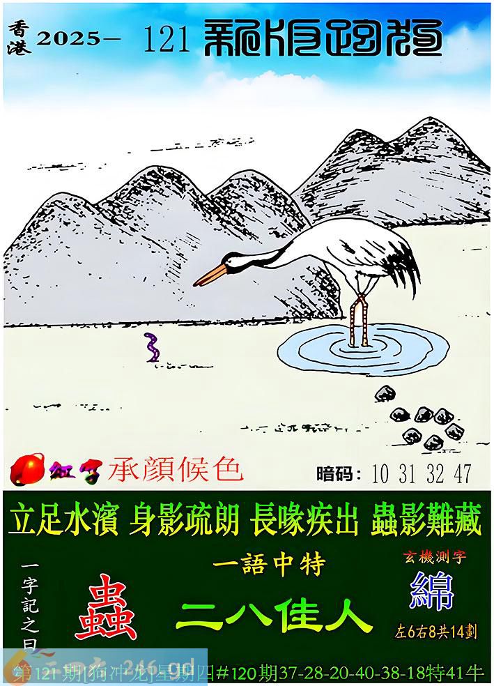 121期跑狗一字記之曰:【蟲】 立足水濱,身影疏朗。 長喙疾出,蟲影難藏。 玄機測字:《綿》 一語中特:二八佳人