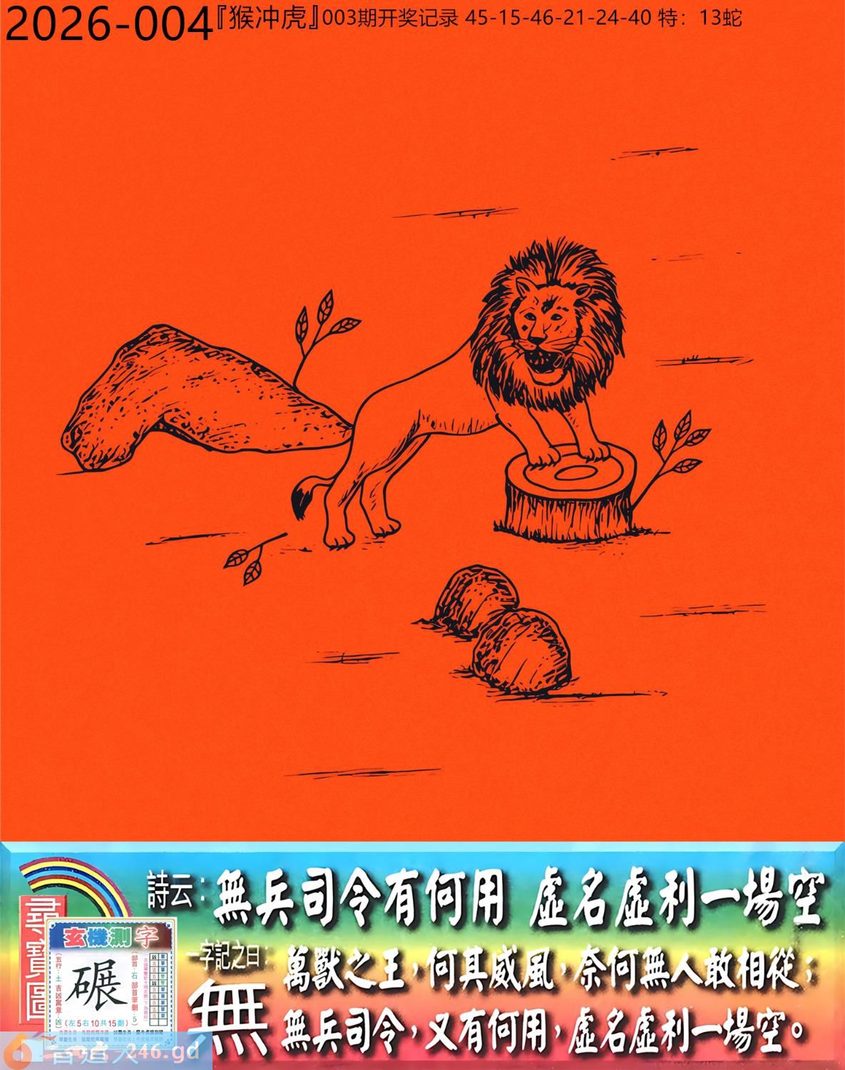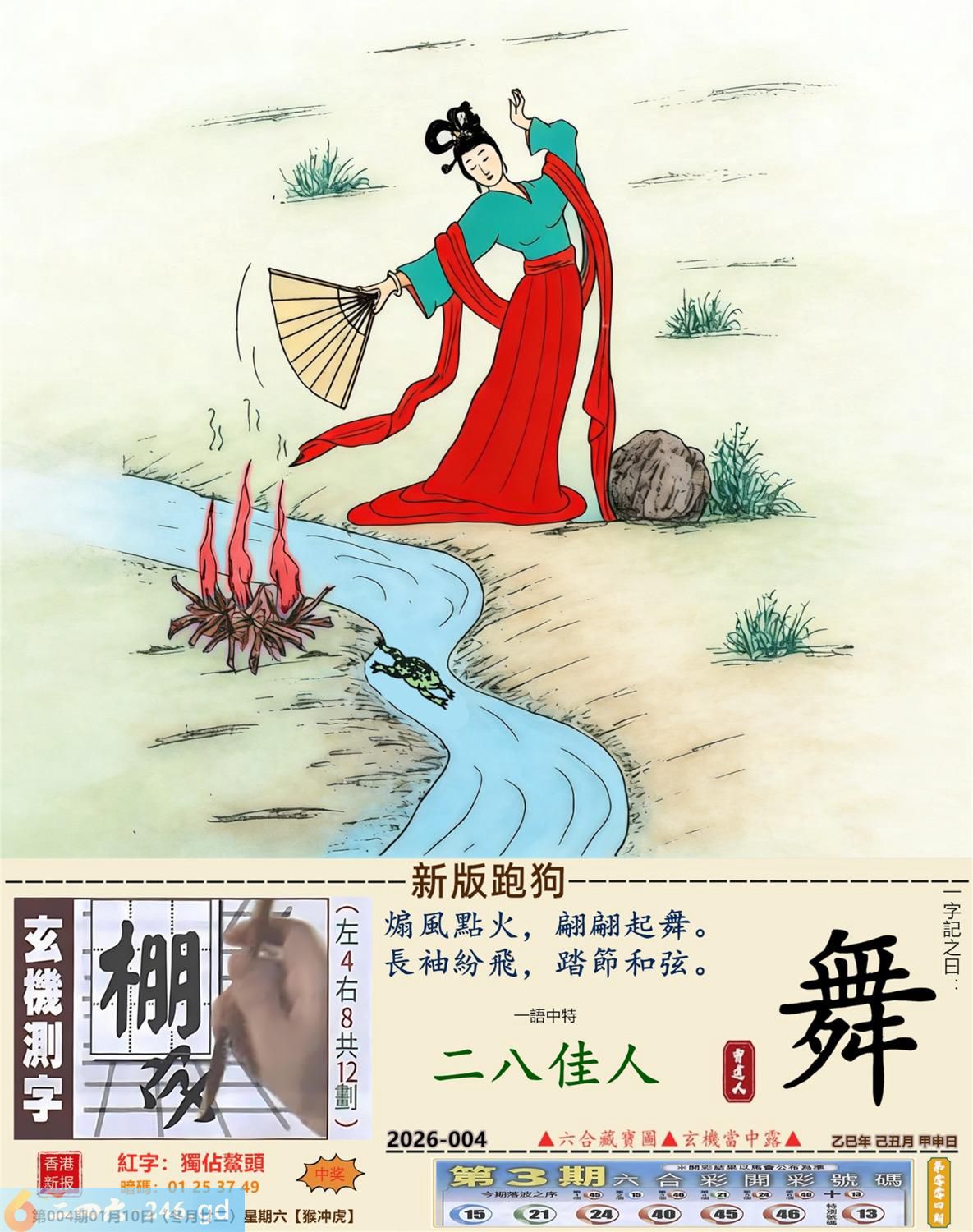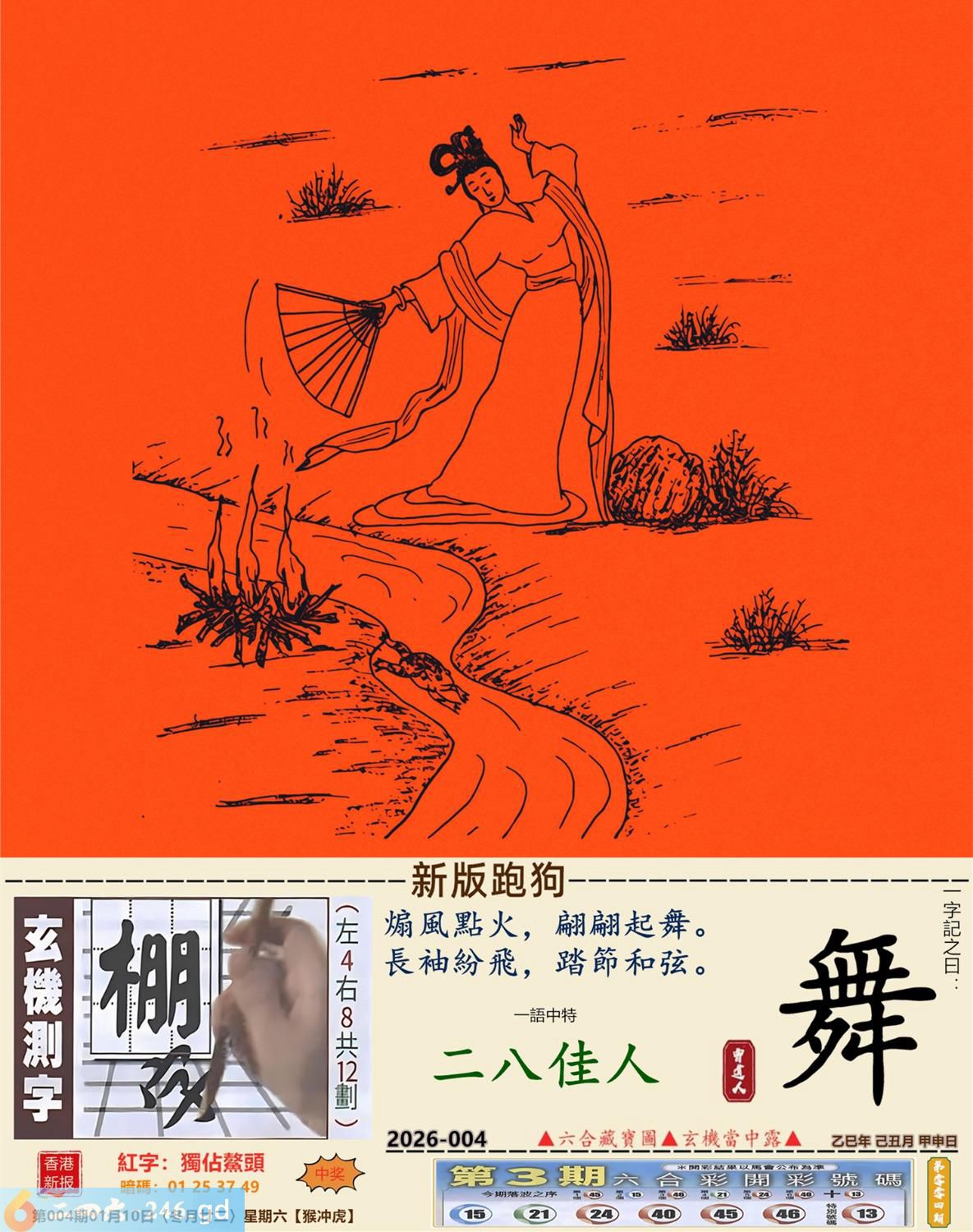 2026年1月10日004期虎(戊寅)(泉中水) 004期:老版跑狗玄機一字記之曰:【無】 詩云:無兵司令有何用虛名虛利一場空 萬獸之王,何其威風,奈何無人敢相從; 無兵司令,又有何用,虛名虛利一場空。 玄機測字:《碾》 密圖詩:一對核桃一對棗 《記》:試看中有玉兔 特碼大小單雙句:伸手要錢 今期必中:黄月英 004期:特碼歇后語 葵花的盘子-----老转向 004期正版四字梅花诗:涉险过关。 004期火车头:烧伤马。诗:羊死龙伤,四书五经读一生。 004期香港第一手欲钱料:一。 004期曾道人说:“人?” 004期另版四字梅花诗:七十二变。 004期香港第一手欲钱料:欲钱找世界最高楼。 004期曾道人说:“为什么现代的人喜欢赌博”? 004期:二字經:帶頭 004期:白头翁是特码 004期:智力金壤:春和景明 004期:信箱紅字:【獨占鰲頭】 004期:【暗碼:01-25-37-49】 004期:一語中特:【二八佳人】 發財玄機圖:伺機而動狡猾敏捷圖中明蛇鼠藍綠 004期:藏寳圖 新:天教谪入群花苑 老:乌蒙磅礴走泥丸 禁:狗禁:1尾玄机字《收》 2026年004期【生活幽默】版 〖精神病院〗 一精神病院裏,院長想看看他的病人到了什程度,就在他們面前放了一祗兔子。 第一個病人上去:"駕!駕!駕!" 第二個病人:"駕,快去追他!"院長無奈地嘆了口氣。 此時,院長看見第三個病人在那一直摸那衹兔子,滿意地點了點頭。没想到那個病人却説: "小樣,先讓你們300米,等我擦完車再説。"