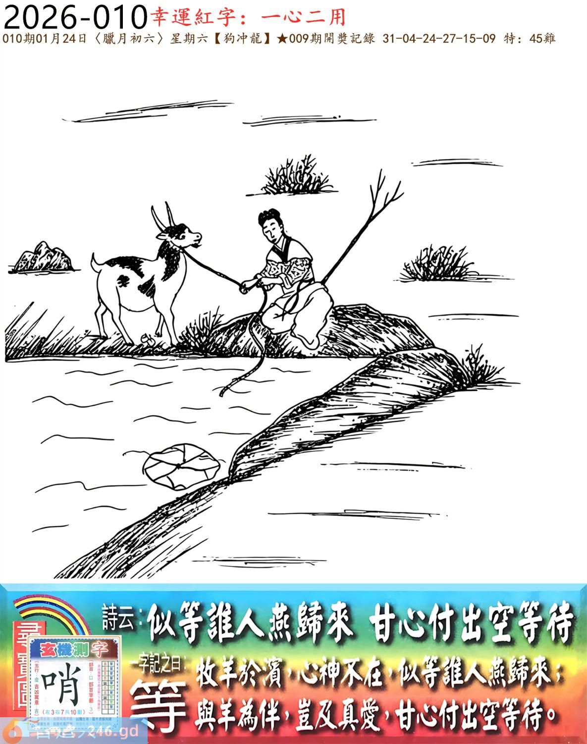 2026年1月24日010期龙(壬辰)(平地木) 010期:老版跑狗玄機一字記之曰:【等】 詩云:似等誰人燕歸來甘心付出空等待 牧羊於濱,心神不在,似等誰人燕歸來; 與羊為伴,豈及真愛,甘心付出空等待。 玄機測字:《哨》 密圖詩:山中無老虎 《記》:三門自有九尾數 特碼大小單雙句:抱着老婆暖被窩 今期必中:貂禪 010期:特碼歇后語 枣木疙瘩-----越老越结实 010期正版四字梅花诗:大张旗鼓。 010期火车头:烧伤马。诗:羊死龙伤,四书五经读一生。 010期香港第一手欲钱料:火。 010期曾道人说:“九?” 010期另版四字梅花诗:新春多福。 010期香港第一手欲钱料:欲钱找红色的动物。 010期曾道人说:“为什么春节期间家家户户都要放鞭炮呢”? 010期:二字經:深村 010期:路口有特码 010期:智力金壤; 010期:信箱紅字:【枯樹生華】 010期:【暗碼:25-29-37-41】 010期:一語中特:【四捨五入】 發財玄機圖:舐犢情深體型龐大圖中明牛藍綠 010期:藏寳圖 新:同向尘中叁拾载 老:秋槐叶落空宫里 禁:虎禁:1尾玄機字《辑》 2026年010期【生活幽默】版 〖分家産〗 一個富人快死了,分别给兩個兒子一把很鈍柴刀,説你們去砍一天的柴,誰砍的柴多,我就把家都給他。 大兒子拿了柴刀,急匆匆就上山砍柴去了。 二兒子拿過刀看了看,找了一把磨刀石,開始磨刀。 没過一會兒磨好了,拿着刀進屋對老爸説:"快把錢都拿出來!"