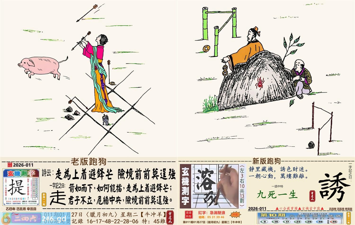 2026年1月27日011期羊(乙未)(壁上土) 011期:老版跑狗玄機一字記之曰:【走】 詩云:走為上着避鋒芒險境前前莫逞強 箭如雨下,如何能擋,走為上着避鋒芒; 君子不立,危牆中央,險境前前莫逞強。 玄機測字:《提》 密圖詩:酒足飯飽去按摩 《記》:同桌對座賽象棋 特碼大小單雙句:一窩鳥蛋有六個 今期必中:趙雲 011期:特碼歇后語 早上没刷牙-----嘴巴不干净 011期正版四字梅花诗:恕不奉陪。 011期火车头:烧伤龙。诗:鸡死猪伤,十二生肖排第四。 011期香港第一手欲钱料:龙? 011期曾道人说:“木?” 011期另版四字梅花诗:四面青山。 011期香港第一手欲钱料:欲钱找伶俐的动物。 011期曾道人说:“为什么每个人都比较喜欢钱呢”? 011期:二字經:好數 011期:电灯是特码 011期:智力金壤;一丝不挂 011期:信箱紅字:【急湍駛浪】 011期:【暗碼:05-31-39-46】 011期:一語中特:【九死一生】 發財玄機圖:冷静守候弓身嘶聲圖中明蛇紅綠 011期:藏寳圖 新:因想后湖题柱处 老:汉城黄柳映新帘 禁:虎禁:4尾玄机字《踌》 2026年011期【生活幽默】版 〖未來岳父〗 今天去女朋友家,心裏异常緊張。 晚上吃飯的時候,未来岳父多喝了兩杯,就跟我:"小李啊,我看你這人很有自信,胸懷寬廣,想必以後必成大器,女兒交給你我也就放心了。"聽得我那個高興,忙問這您也能看出來啊? 他回答道:"我瞧你長得這鳥樣,也敢泡我女兒,説明你這人不簡單。" 我......