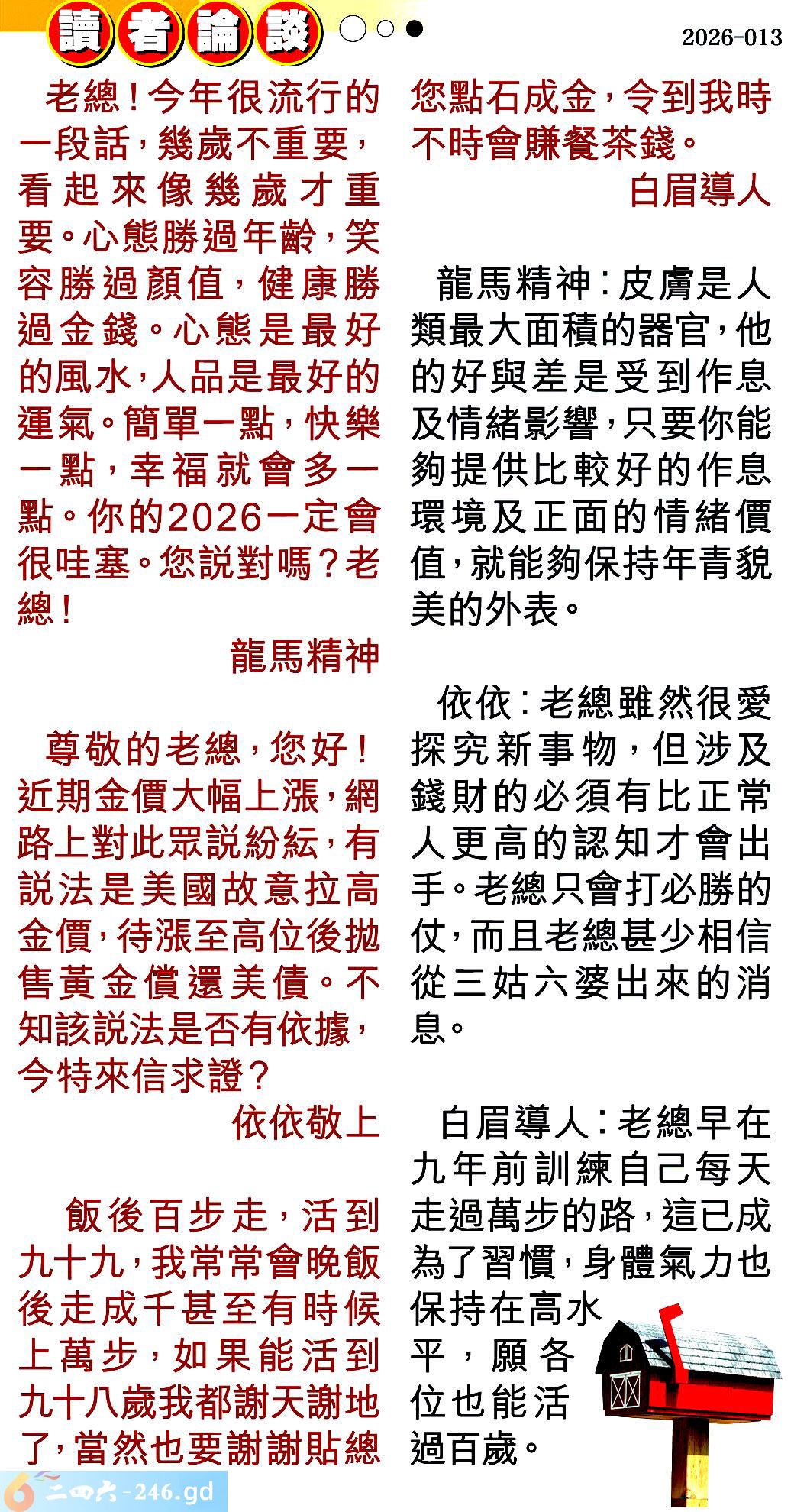 第013期讀者論談 1.老總!今年很流行的一段話,幾歳不重要,看超來像幾歲才重要。心態勝過年齡,笑容勝過顔值,健康勝過金錢。心態是最好的風水,人品是最好的運氣,簡單一點,快樂一點,幸福就會多一點。你的2026一定會很哇塞。您説對嗎?老總!龍馬精神 〖龍馬精神〗:皮膚是人類最大面積的器官,他的好與差是受到作息及情緒影響,只要你能夠提供比較好的作息環境及正面的情緒價值,就能夠保持年青貌美的外表。 2.尊敬的老總,您好!近期金價大幅上漲,網路上對此眾説紛纭,有説法是美國故意拉高金價,待漲至高位後抛售黃金償還美債。不知該説法是否有依據,今特來信求證?依依敬上 〖依依〗:老總雖然很愛探究新事物,但涉及錢財的必須有比正常人更高的認知才會出手。老總只會打必勝的仗,而且老總甚少相信從三姑六婆出來的消息。 3.飯後百步走,活到九十九,我常常會晚飯後走成千甚至有時候上萬步,如果能活到九十八歲我都谢天謝谢地了,當然也要謝謝貼總您點石成金,令到我時不時會赚餐茶錢。白眉導人 〖白眉導人〗:老總早在九年前訓練自己每天走過萬步的路,這已成為了習慣,身體氣力也保持在高水平,願各四位也能活過百歲。
