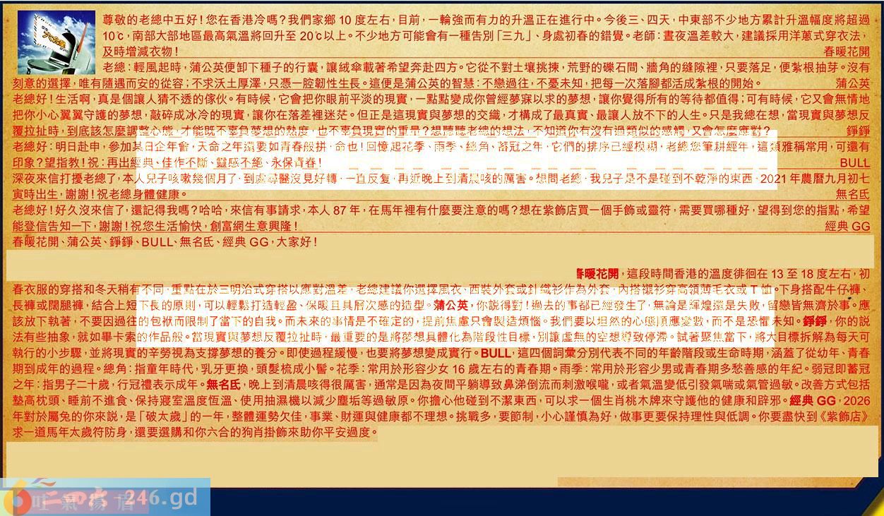 第014期《六合皇信箱文字版》10000%正確!!!正版二四六論壇*精心製作!!! 春暖花開、蒲公英、錚錚、、無名氏、經典,大家好! 【1】.尊敬的老總中五好!您在香港冷嗎?我們家鄉10度左右,目前,一輪強而有力的升溫正在進行中。今後三、四天,中東部不少地方累計升溫幅度將超過10,南部大部地區最高氣溫將回升至20'以上。不少地方可能會有一種告別「三九」、身處初春的錯覺。老師:畫夜溫差較大,建議採用洋蒽式穿衣法及時增減衣物!春暖花開 〖春暖花開〗:這段時間香港的溫度徘徊在13至18度左右,初春衣服的穿搭和冬天稍有不同,重點在於三明治式穿搭以應對溫差,老總建議你選擇風衣、西装外套或針織衫作為外套,內搭襯衫穿高領薄毛衣或工恤。下身搭配牛仔禪、長褲或闊腿褲,結合上短下長的原則,可以輕鬆打造輕盈、保暖且具層次感的造型。 【2】.老總:輕風起時,蒲公英便卸下種子的行囊,讓絨傘載著希望奔赴四方。它從不對土壤挑揀,荒野的礫石間、牆角的缝隙裡,只要落足,便梨根抽芽。沒有刻意的選擇,唯有随遇而安的從容;不求沃土厚澤,只源一腔翱性生長。這便是蒲公英的智慧:不戀過往,不要未知,把每一次落腳都活成紮根的開始。蒲公英 〖蒲公英〗:你説得對!過去的事都已經發生了,無論是輝煌還是失敗,留戀皆無濟於事。應該放下執著,不要因過往的包袱而限制了富下的自我。而未來的事情是不確定的,提前焦慮只會製造煩惱。我們要以坦然的心態順應變數,而不是恐耀未知。 【3】.老總好!生活啊,真是個讓人猜不透的瘃伙。有時候,它會把你眼前平淡的現實,一點點變成你曾經萝寐以求的夢想,讓你覺得所有的等待都值得;可有時候,它又會無情地把你小心翼翼守護的夢想,敲碎成冰冷的現實,讓你在落差裡迷茫。但正是這現實與夢想的交織,才構成了最真實、最讓人放不下的人生。只是我總在想,當現實與夢想反覆拉扯時,到底該怎麼調整心態,才能既不辜負夢想的熱度,也不辜負現實的重量?想聽聽老總的想法,不知道你有沒有過類似的感觸,又會怎麼應對?錚錚 〖錚錚〗:你的説法有些抽象,就如畢卡索的作品般。當現實與夢想反覆拉扯時,最重要的是將萝想具體化為階段性目標,別讓虚無的空想導致停滞。試著聚焦當下,將大目標拆解為每天可執行的小步驟,並將現寶的辛勞視為支撑夢想的養分。即使過程緩慢,也要將萝想變成實行。 【4】.老總好:明日赴申,參加某日企年會,天命之年還要如青春般拼,命也!回憶起花季、雨季、總角、蓄冠之年,它們的排序已經模糊,老總您筆耕經年,這類雅稱常用,可還有印象?望指教!祝:再出經典、佳作不斷、靈感不絕、永保青春! 〖〗:這四個詞彙分別代表不同的年齡階段或生命時期,涵蓋了從幼年、青春期到成年的過程。總角:指童年時代,乳牙更換,頭髪梳成小髻。花季:常用於形容少女16歲左右的青春期。雨季:常用於形容少男或青春期多愁善感的年紀,弱冠即蓄冠之年:指男子二十歲,行冠禮表示成年。 【5】.深夜來信打擾老總了,本人兒子咳嗽幾個月了,到處尋醫沒見好轉,一直反复,再近晚上到清晨咳的属害。想間老總,我兒子是不是碰到不乾淨的東西,2021年農暦九月初七寅時出生,謝謝!祝老總身體健康。無名氏 〖無名氏〗:晚上到清晨咳得很厲害,通常是因為夜間平躺導致鼻涕倒流而刺激喉嚨,或者氣溫變低引發氣喘或氣管過敏。改善方式包括塾高枕頭、睡前不進食、保持寝室溫度恆溫、使用抽濕機以減少麈垢等過敏原。你擔心他碰到不潔東西,可以求一個生肖桃木牌來守護他的健康和辟邪。 【6】.老總好!好久沒來信了,還記得我嗎?哈哈,來信有事請求,本人87年,在馬年裡有什麼要注意的嗎?想在紫飾店買一個手飾或靈符,需要買哪種好,望得到您的指點,希望能登信告知一下,謝謝!祝您生活愉快,創富網生意興隆!經典 〖經典〗:2026年對於屬免的你來説,是「破太歲」的一年,整體運勢欠佳,事業、財運與健康都不理想。挑戰多,要節制,小心謹慎為好,做事更要保持理性與低調。你要盡快到《紫飾店》求一道馬年太歲符防身,還要選購和你六合的狗肖掛飾來助你平安過度。 紅字:吐氣揚眉 暗码:13172527 [释义]形容受压抑的心情得以舒展而感到快意。 [出处]元.汤式〈一枝花.雍容黄阁姿套.尾声〉:「借尺地寸阶,进一言半策,那时节吐气扬眉拜丰采。」也作「扬眉吐气」。