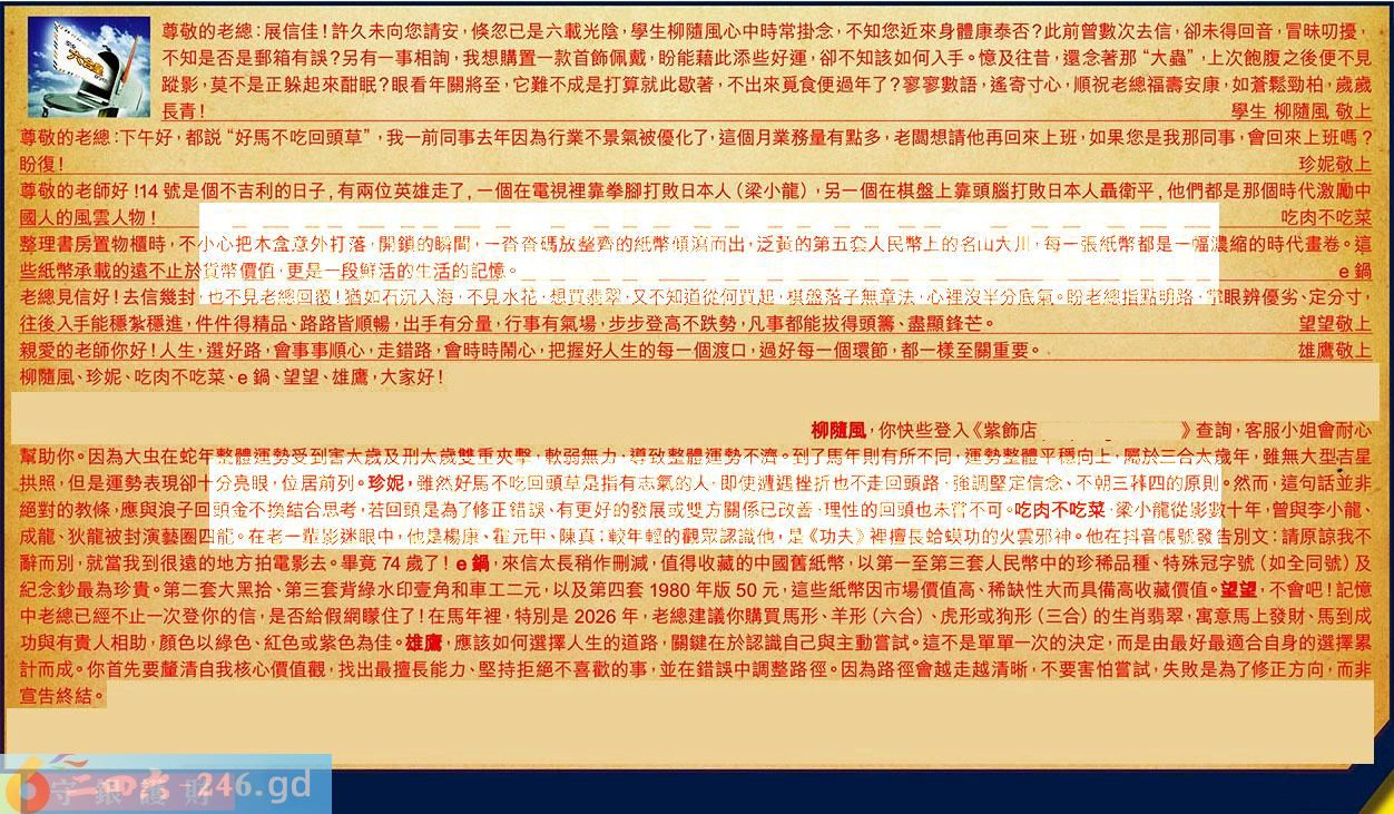 第017期《六合皇信箱文字版》10000%正確!!!正版二四六論壇*精心製作!!! 柳隨風、珍妮、吃肉不吃菜、鍋、望望、雄鷹,大家好! 【1】.尊敬的老總:展信佳!許久未向您請安,倏忽已是六载光陰,學生柳隨風心中時常掛念,不知您近來身體康泰否?此前曾數次去信,卻未得回音,冒昧叨擾不知是否是郵箱有誤?另有一事相詢,我想購置一款首飾佩戴,盼能藉此添些好運,卻不知該如何入手。憶及往昔,還念著那“大蟲”,上次飽腹之後便不見蹤影,莫不是正躲起來酣眠?眼看年關將至,它難不成是打算就此歇著,不出來觅食便過年了?寥寥數語,遙寄寸心,順祝老總福壽安康,如蒼鬆勁柏,歲歲長青!學生柳隨風敬上 〖柳隨風〗:你快些登入《紫飾店》查詢,客服小姐會耐心幫助你。因為大虫在蛇年整體運勢受到害太歲及刑太歲雙重夾擊,軟弱無力,導致整體運勢不濟。到了馬年則有所不同,運勢整體平穩向上,屬於三合太歲年,雖無大型吉星拱照,但是運勢表現卻十分亮眼,位居前列。 【2】.尊敬的老總:下午好,都説“好馬不吃回頭草”,我一前同事去年因為行業不景氣被優化了,這個月業務量有點多,老闊想請他再回來上班,如果您是我那同事,會回來上班嗎?盼復!珍妮敬上 〖珍妮〗:雖然好馬不吃回頭草是指有志氣的人,即使遭遇挫折也不走回頭路,強調堅定信念、不朝三暮四的原則。然而,這句話並非絕對的教條,應與浪子回頭金不換結合思考若回頭是為了修正錯誤、有更好的發展或雙方關係已改善,理性的回頭也未嘗不可。 【3】.尊敬的老師好!14號是個不吉利的日子,有兩位英雄走了,一個在電視裡靠拳腳打敗日本((梁小龍),另一個在棋盤上靠頭腦打敗日本人聶衛平,他們都是那個時代激勵中國人的風雲人物!吃肉不吃菜 〖吃肉不吃菜〗:梁小龍從影數十年,曾與李小龍、成龍、狄龍被封演藝圈四龍。在老一輩影迷眼中,他是楊康、霍元甲、陳真;較年輕的觀眾認識他是《功夫》裡擅長蛤蟆功的火雲邪神。他在抖音帳號發告别文:請原諒我不辞而別,就當我到很遠的地方拍電影去。畢竟74歲了! 【4】.整理書房置物櫃時,不小心把木盒意外打落,開鎖的瞬間,一沓沓碼放整齊的紙幣傾瀉而出,泛黄的第五套人民幣上的名山大川,每一張紙幣都是一幅濃縮的時代畫卷。這些紙幣承載的遠不止於貨幣價值,更是一段鮮活的生活的記憶。鍋 〖鍋〗:來信太長稍作删刪減,值得收藏的中國舊紙幣,以第一至第三套人民幣中的珍稀品種、特殊冠字號(如全同號)及紀念鈔最為珍貴。第二套大黑拾、第三套背緑水印壹角和車工二元,以及第四套1980年版50元,這些紙幣因市場價值高、稀缺性大而具備高收藏價值。 【5】.老總見信好!去信幾封,也不見老總回覆!猶如石沉入海,不見水花,想買翡翠,又不知道從何買起,棋盤落子無章法,心裡沒半分底氣。盼老總指點明路,掌眼辨優劣、定分寸,往後入手能穩紮穩進,件件得精品、路路皆順暢,出手有分量,行事有氣場,步步登高不跌勢,凡事都能拔得頭籌、盡顯鋒芒。望望敬上 〖望望〗:不會吧!記憶中老總已經不止一次登你的信,是否給假網朦住了!在馬年裡,特别是2026年,老總建議你購買馬形、羊形((六合)、虎形或狗形(三合)的生肖翡翠,寓意馬上發財、馬到成功與有貴人相助,顔色以緑色、紅色或紫色為佳。 【6】.親愛的老師你好!人生,選好路,會事事順心,走錯路,會時時鬧心,把握好人生的每一個渡口,過好每一個環節,都一樣至關重要。雄鹰敬上 〖雄鷹〗:應該如何選擇人生的道路,關鍵在於認識自己與主動嘗試。這不是單單一次的決定,而是由最好最適合自身的選擇累計而成。你首先要釐清自我核心價值觀,找出最擅長能力、堅持拒絕不喜歡的事,並在錯誤中調整路徑。因為路徑會越走越清晰,不要害怕嘗試,失敗是為了修正方向,而非宣告終結。 紅字:守銀護財 暗码:01353739 [释义]谨慎管理、保全已有财产,防止流失。