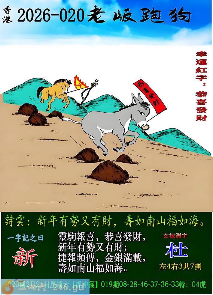 020期老版跑狗一字記之曰:【新】 詩雲:新年有勢又有財,壽如南山福如海。 靈駒報喜,恭喜發財,新年有勢又有財; 捷報頻傳,金銀滿載,壽如南山福如海。 玄機測字:《杜》