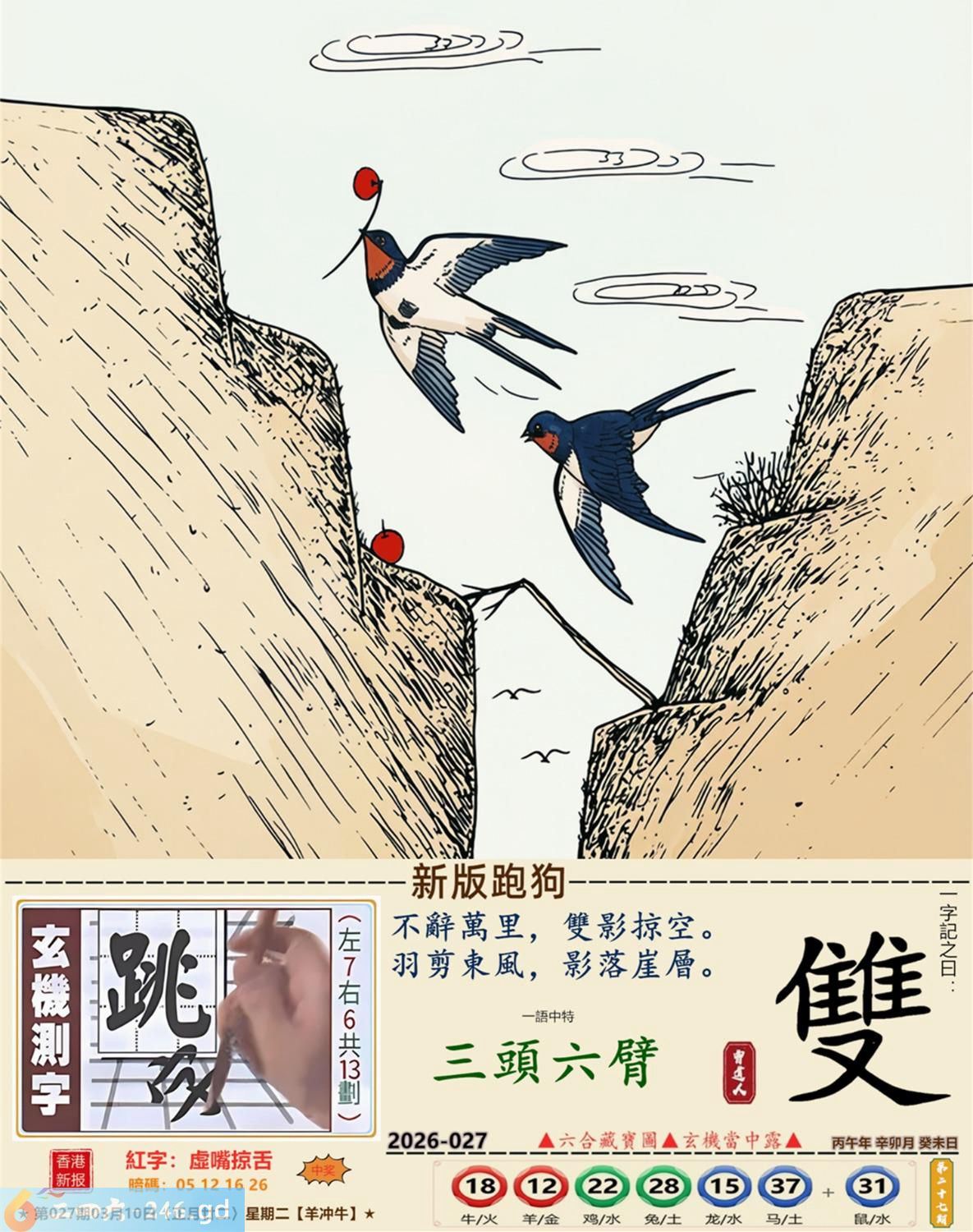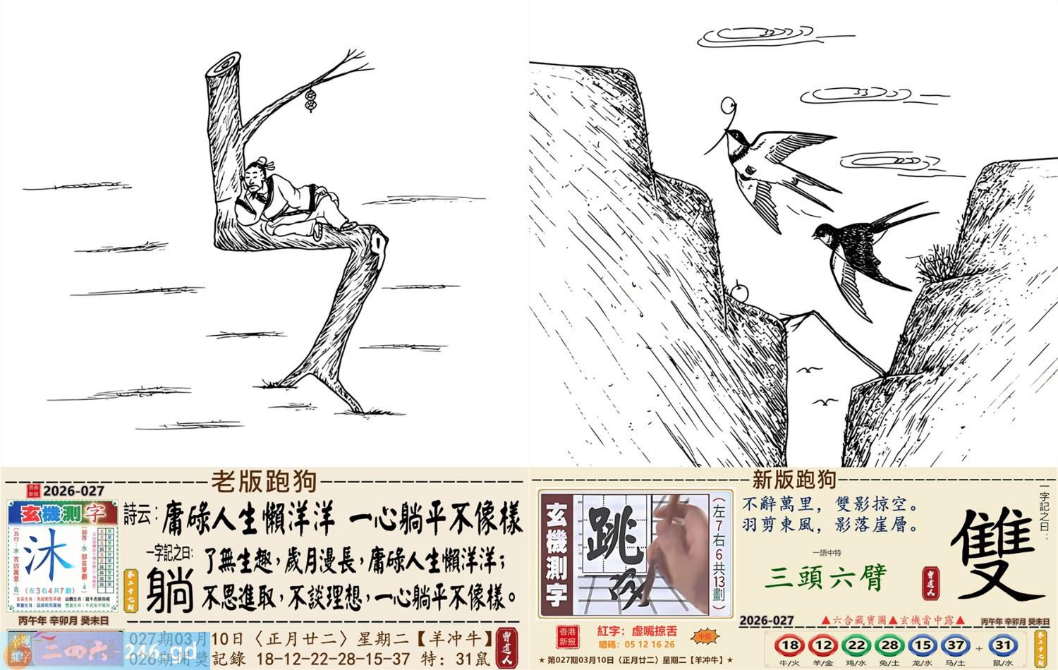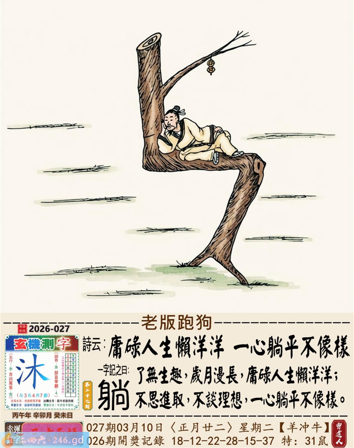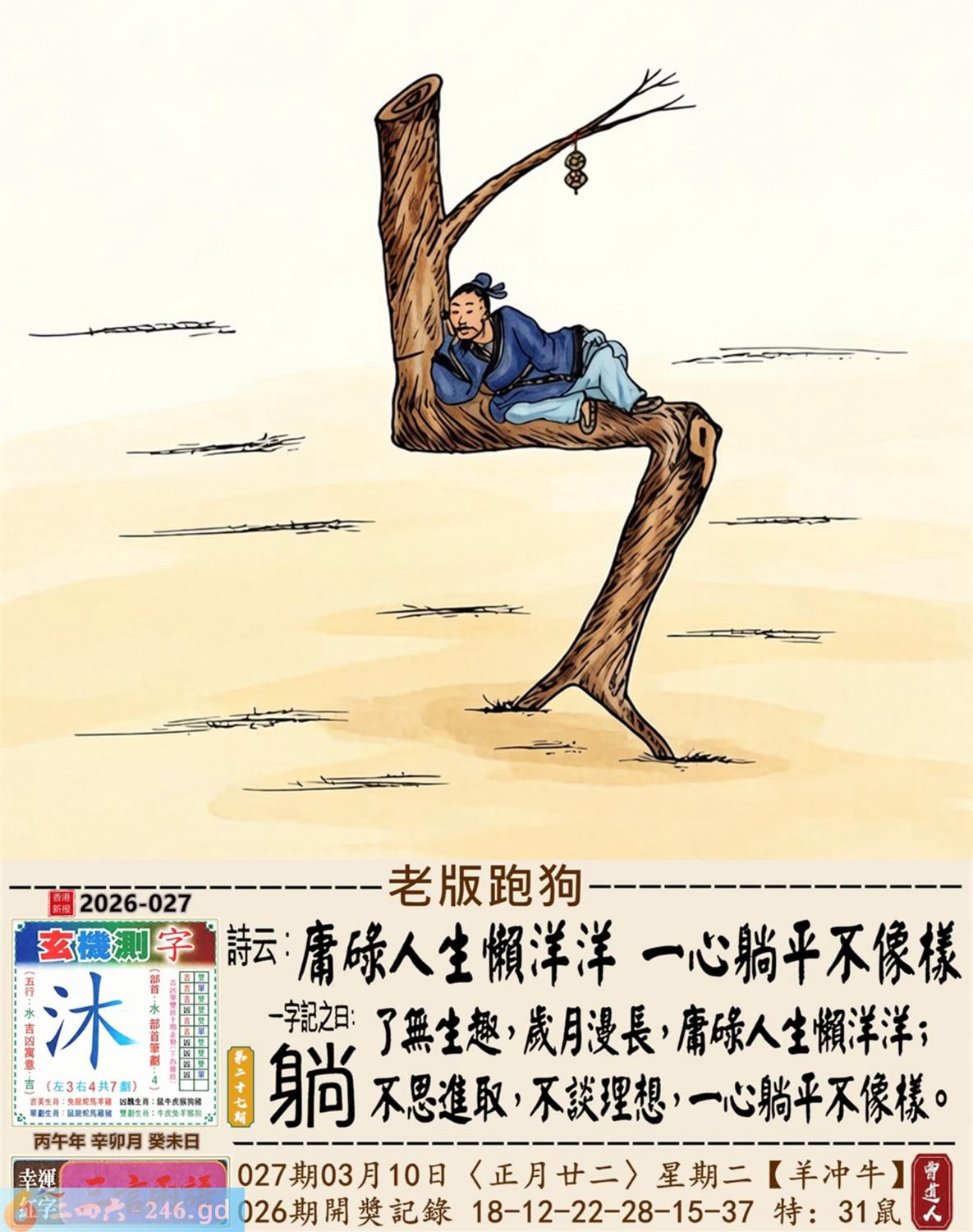 2026年3月10日星期二杨柳木羊日冲牛 027期:老版跑狗玄機一字記之曰:【躺】 詩云:庸碌人生懶洋洋,一心躺平不像樣。 了無生趣,歲月漫長,庸碌人生懶洋洋; 不思進取,不談理想,一心躺平不像樣。 玄機測字:《沐》 密圖詩:一群好漢三人幫 記:落入平川斷其尾 特碼大小單雙句:單憑九字定財局 今期必中:馬鐵 027期:特碼歇后語 洗衣不用搓板-----就凭一双手 027期正版四字梅花诗:酒醉饭饱。 027期火车头:烧伤猴。诗:牛死龙伤,今期生肖住门庭。 027期香港第一手欲钱料:子? 027期曾道人说:“天下第一”? 027期另版四字梅花诗:束手待毙。 027期香港第一手欲钱料:欲钱买站立睡眠的动物。 027期曾道人说:“找赋性愚蠢太无知” 027期二字经:提挈。 027期:曾英权是特码 027期:智力金壤:直抒己见。 027期紅字:【虛嘴掠舌】 027期暗碼:【05121626】 發財玄機圖:獨立冷靜友善親人圖中明狗藍綠 027期:藏寶圖 新:只今莫唱贞元曲 老:悄立市桥人不识 禁:蛇禁:2尾玄機字《莼》 2026年027期【生活幽默】版 〖機智善談 〗 生活幽默機智善談 陸某,機智善談。邻家有一婦人,不苟言笑。朋友對陸某説:"你若能説一字,逗此婦人發笑;再一字,令此婦人罵街,我就請你吃飯。" 陸某答應,于是二人同去找那婦人。婦人正站在門口,門外還有衹狗。 陸某急走幾步,來到狗跟前,撲通一聲跪下了:喊到:"爹!" 婦人一愣,随即笑了起来。 陸某又抬起頭,對婦人:"娘!"婦人破口大罵。