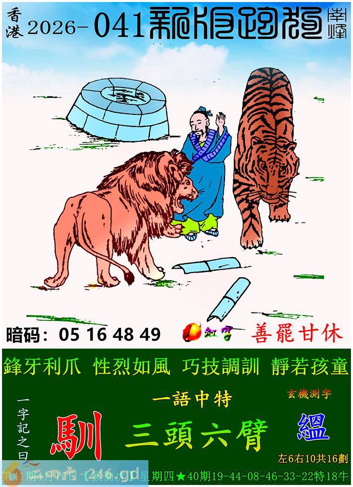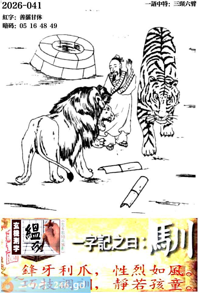 041期跑狗一字記之曰:【馴】 鋒牙利爪,性烈如風。 巧技調訓,靜若孩童。 玄機測字:《縕》 一語中特:三頭六臂