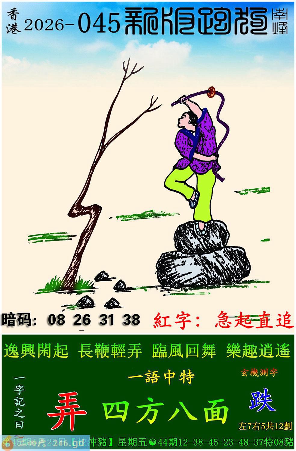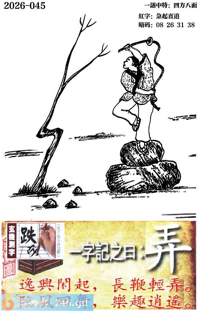045期跑狗一字記之曰:【弄】 逸興閑起,長鞭輕弄。 臨風回舞,樂趣逍遙。 玄機測字:《跌》 一語中特:四方八面